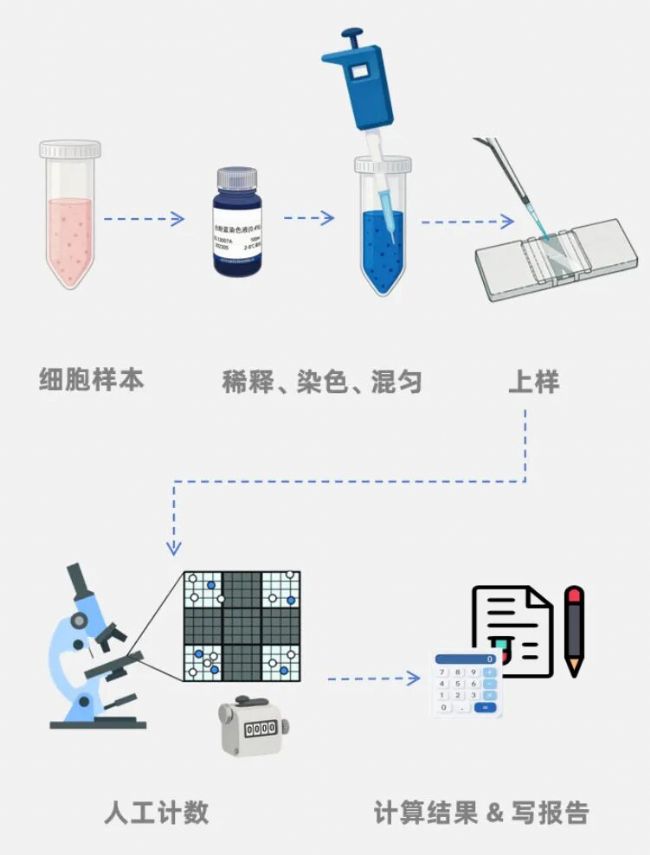 手工血球計數(shù)板搭配臺盼藍染色是沿用近百年的金標準方法,但其固有缺陷不容忽視:操作者間差異、計數(shù)樣本少導致統(tǒng)計學局限、連續(xù)計數(shù)多個樣本后,人眼分辨力顯著下降。