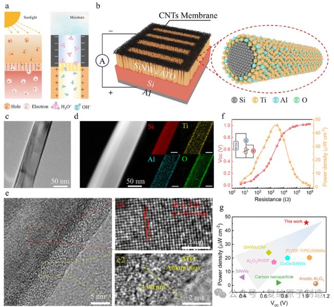圖 1 器件設計原理、結構和電性能。(a)p-n 結光伏效應與納米流體離子二極管整流效應的類比;(b)SiNWs/ATO HEG 器件結構示意圖;(c)SiNWs/ATO 的 TEM 圖;(d)SiNWs/ATO 的 EDX 元素映射圖;(e)SiNWs/ATO 的 HRTEM 圖及局部放大圖;(f)輸出電壓和功率密度隨外負載的變化;(g)本研究 HEG 與文獻報道 HEG 的性能對比