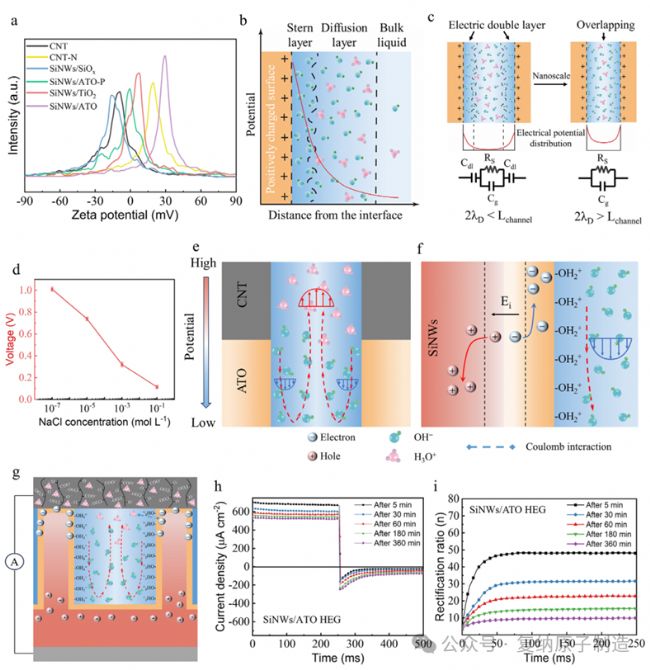 zeta 電位測試顯示(如圖 2a),原始 CNT 和 SiNWs/SiOₓ帶負電,而 SiNWs/ATO 帶強正電(+29.9 mV),二者形成的納米流體離子二極管使 OH⁻富集于 SiNWs/ATO 通道、H₃O⁺ 積累于 CNT 膜,形成疊加的縱向靜電場,強化離子定向輸運。低離子濃度下德拜長度更大,離子整流效率更高,NaCl 濃度升高會導致器件電壓大幅下降。