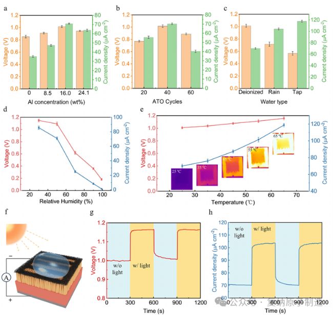 研究確定了器件最優(yōu)工藝參數(shù):Al 摻雜濃度 16.0 wt%、ATO 層厚度 4.9 nm。環(huán)境因素對器件性能影響顯著,低濕度、高溫更利于輸出,溫度升至 65℃時短路電流密度增至 118.7 μA・cm⁻²;標準 AM 1.5 光照下,器件產生光伏效應,實現(xiàn)水伏 - 光伏雙模式能量收集,開路電壓升至 1.16 V、短路電流密度達 103.4 μA・cm⁻²(如圖 4)。