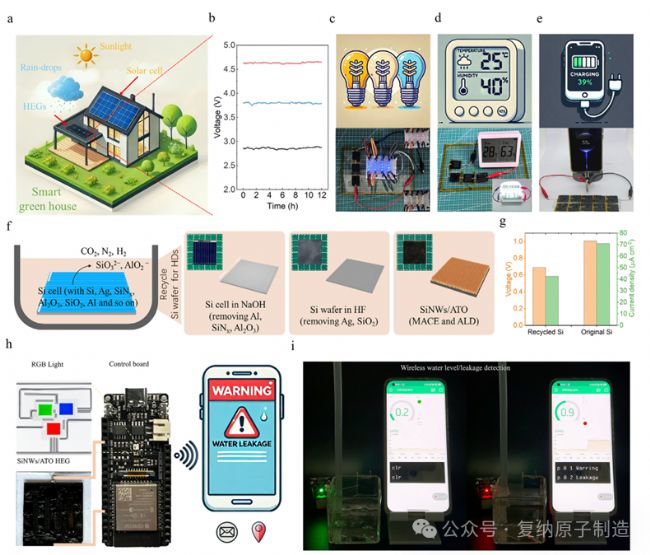圖 5 SiNWs/ATO HEG 的電源與傳感應用。(a)太陽能電池與 HEG 集成的智能溫室示意圖;(b)3/4/5 個器件串聯(lián)的輸出電壓;(c)3 個串聯(lián)器件驅動 LED 的實物圖;(d)串聯(lián)器件驅動溫濕度計的實物圖;(e)器件陣列為智能手機充電的實物圖;(f)退役太陽能電池硅片的回收流程;(g)回收 / 原始硅片制備 HEG 的性能對比;(h)HEG 基傳感器件的電路模型;(i)水位 / 漏水檢測的人機交互實物圖