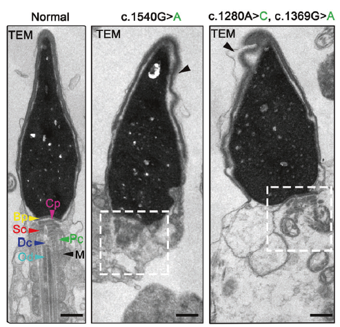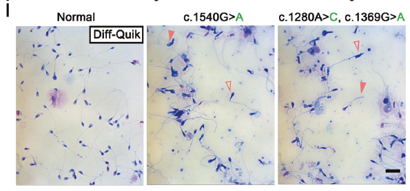 圖1:HNRNPR突變導(dǎo)致精子頂體脫落及形態(tài)異常(原文圖1i-j)