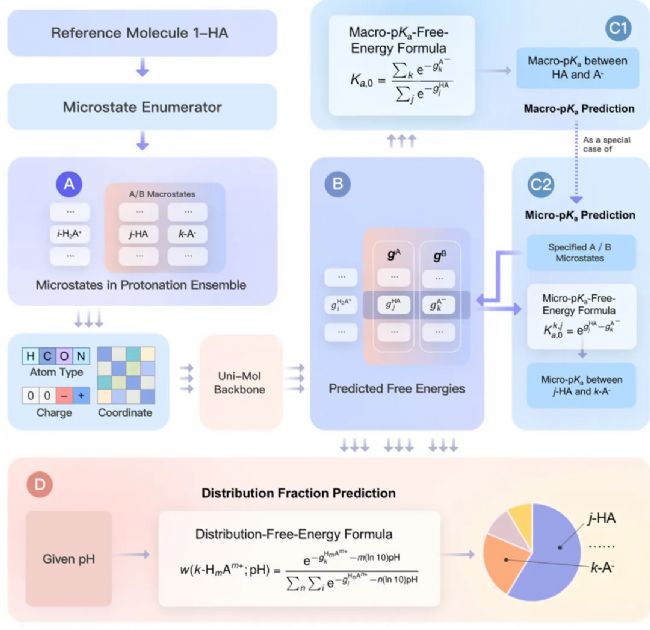 “Uni-pKa 模型(如上圖所示),通過 AI 學(xué)習(xí)分子的三維空間特征并預(yù)測各微觀狀態(tài)的自由能(Section B)。隨后,利用嚴(yán)謹(jǐn)?shù)臒崃W(xué)公式(Section C)將能量信息轉(zhuǎn)化為精準(zhǔn)的 pKa 數(shù)值。這種‘物理規(guī)律約束 AI’的設(shè)計(jì),不僅極大地提升了預(yù)測精度,更確保了復(fù)雜分子在多位點(diǎn)解離時(shí)的邏輯嚴(yán)密性。”