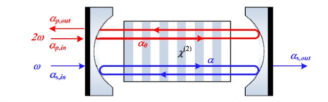 文章中通過下圖中DOPA結(jié)構(gòu)來產(chǎn)生壓縮態(tài),在腔內(nèi)放置了一塊Type-I 型準(zhǔn)相位匹配的周期性極化晶體,并注入泵浦光(2ω 775nm)以及信號光(ω 1550nm)。1550nm的光在DOPA 腔內(nèi)共振,而775nm的光則來回通過晶體。