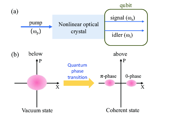 在山西大學(xué)這篇文章中,關(guān)注的是振蕩閾值下DOPA的情況,而對于壓縮態(tài)的產(chǎn)生而言,振蕩閾值以上,變?yōu)镈OPO的情況也具有相當(dāng)?shù)囊饬x,例如在量子計(jì)算中大火的相干伊辛機(jī)(CIM)可以基于DOPO網(wǎng)絡(luò)來實(shí)現(xiàn)人工自旋。當(dāng)位于振蕩閾值以下,處于壓縮真空態(tài),而閾值以上則會(huì)產(chǎn)生對應(yīng)于相位0和π的壓縮相干態(tài)。