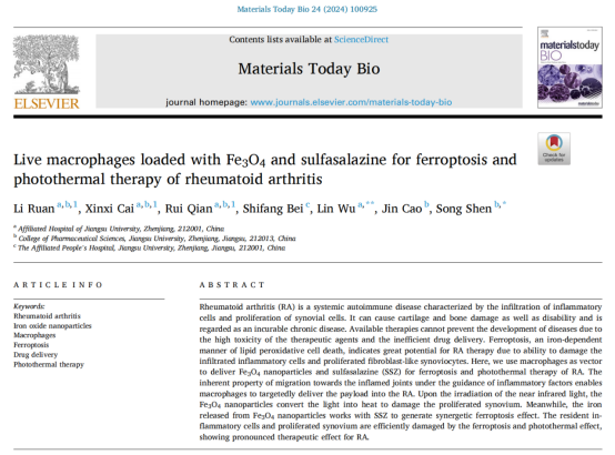 2023年12月來自江蘇大學藥學院及附屬醫(yī)院的研究團隊在《Materials Today Bio》上發(fā)表一種治療RA的新方法:用工程巨噬細胞作為載體,遞送Fe3O4和柳氮磺胺吡啶(sulfasalazine,SSZ),用于RA的鐵死亡和光熱療法。Fe3O4是一種磁性納米材料,可以通過外加磁場實現對巨噬細胞的定向操控。SSZ是一種常用的抗風濕藥物,具有抗炎和免疫調節(jié)作用。研究者利用巨噬細胞固有的炎癥趨化性和對納米顆粒的保護作用,將Fe3O4和SSZ有效運送到RA組織中,在近紅外光(NIR)照射下產生熱量,破壞巨噬細胞,釋放Fe3O4納米顆粒和SSZ,誘導細胞鐵死亡。鐵死亡和光熱效應有效地破壞了駐留的炎癥細胞和增殖的滑膜,對RA有明顯的治療作用(如Fig 1所示)。