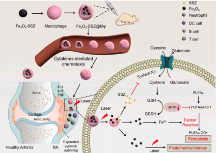 Fig 1. 巨噬細胞介導的RA鐵死亡和光熱治療藥物遞送示意圖
