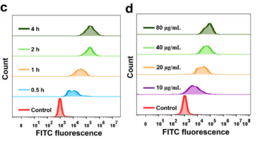 Fig 2. (c) Fe3O4-FITC孵育不同時間(0.5、1、2、4 h)后巨噬細胞的流式分析