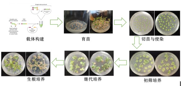 葆光生物采用農(nóng)桿菌介導(dǎo)的葉盤轉(zhuǎn)化法進行植物遺傳轉(zhuǎn)化,其主要過程包括:提取目的基因片段,導(dǎo)入質(zhì)粒構(gòu)建目...