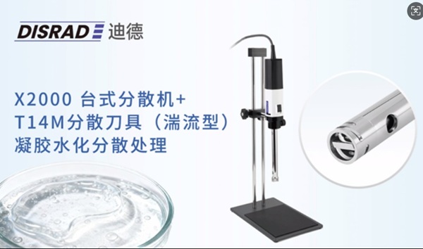 DISRAD迪德 X2000分散機(jī)+T14M分散刀具(湍流型)——凝膠水化分散處理,T系列湍流型分散刀具、轉(zhuǎn)子槳葉式設(shè)計(jì),產(chǎn)生眾多小渦流,剪切力低,熱量低,可快速去除懸浮泡沫或細(xì)小顆粒