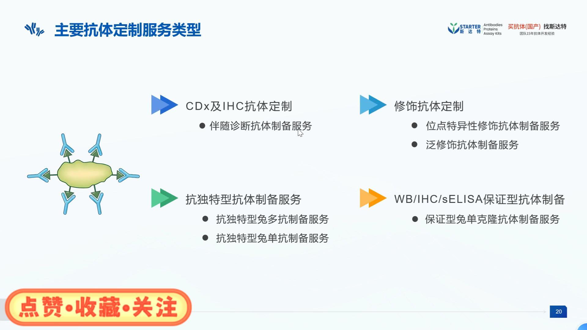 視頻介紹了斯達(dá)特抗體定制服務(wù),包括CDx及IHC抗體定制、修飾抗體定制、抗獨特型抗體制備服務(wù)、WB/IHC/sELISA保證型抗體制備。