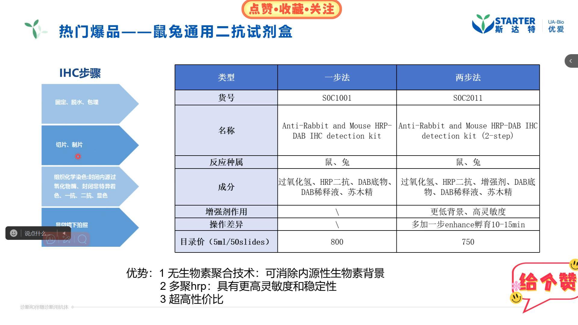 視頻介紹了斯達(dá)特?zé)衢T爆品鼠兔通用二抗試劑盒,無生物素聚合技術(shù),可消除內(nèi)源性生物素背景,具有更高靈敏度和穩(wěn)定性,超高性價比。