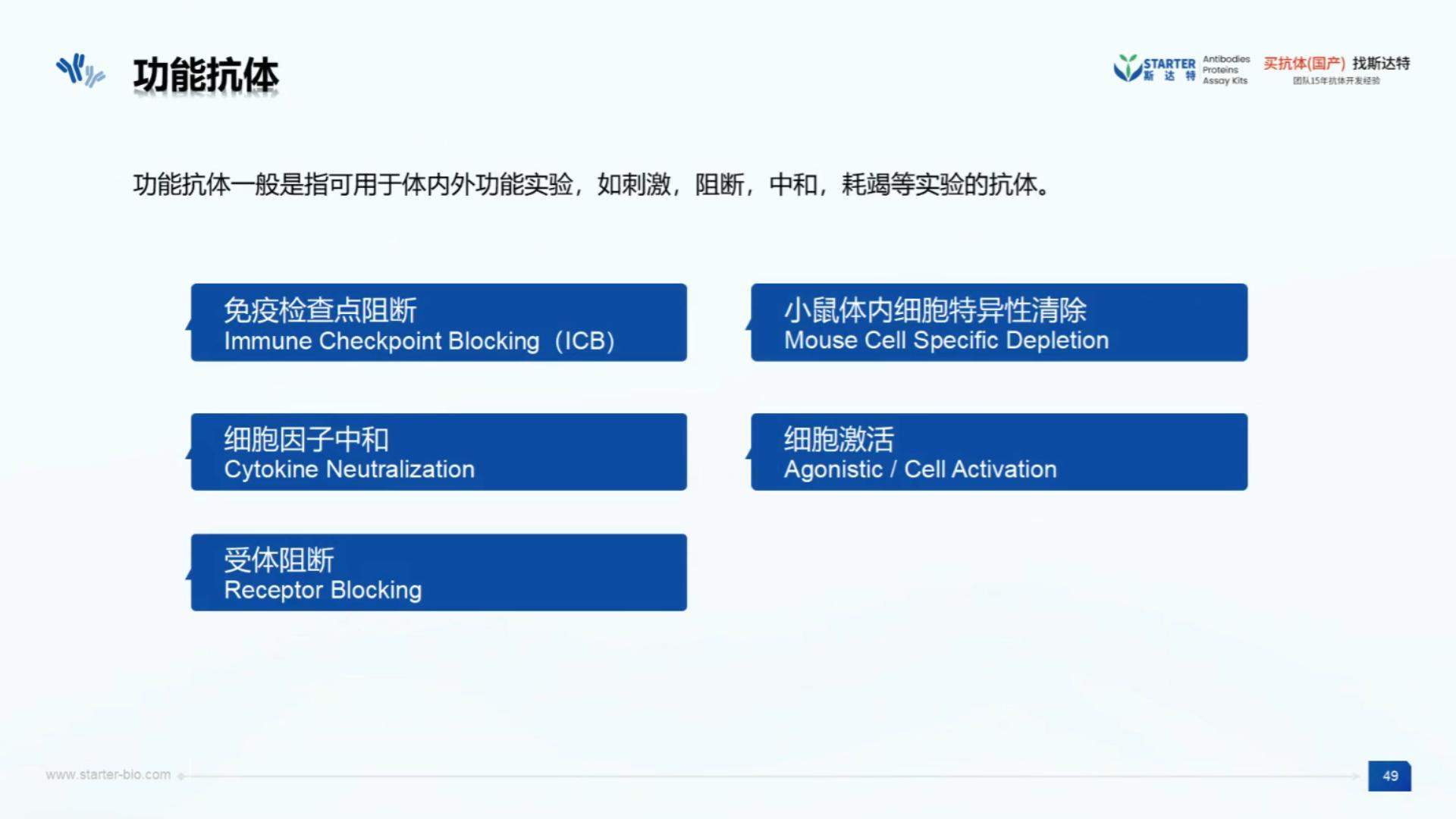 視頻詳細(xì)講解了斯達(dá)特功能抗體產(chǎn)品,功能抗體一般是指可用于體內(nèi)外功能實驗,如刺激、阻斷、中和、耗竭等實驗的抗體。