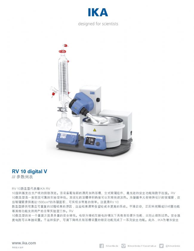 RV 10數(shù)顯型代表著IKA RV 10旋轉(zhuǎn)蒸發(fā)儀生產(chǎn)線的持續(xù)改進(jìn)。該設(shè)備配有新的通用加熱浴槽、立式玻璃組件、最先進(jìn)的安全功能和數(shù)字連接。RV 10數(shù)顯型是一款堅(jiān)固可靠的實(shí)驗(yàn)室伴侶。其優(yōu)化的浴槽體積確??梢詫?shí)現(xiàn)快速加熱。冷凝器單元有特殊設(shè)計(jì)的玻璃管,這些玻璃管提供高達(dá)1500cm²的冷凝面積,可實(shí)現(xiàn)非常高的效率。這就是RV 10 數(shù)顯型提供可靠且可重復(fù)的過程結(jié)果的原因,這些結(jié)果通常保留給成本更高的系統(tǒng)。平滑啟動(dòng)、正反轉(zhuǎn)間隔或計(jì)時(shí)器功能等其他功能支持用戶的日常實(shí)驗(yàn)室工作。RV 10數(shù)顯型的另一個(gè)重要方面是多重的安全特性。電動(dòng)升降機(jī)在斷電的情況下具有自動(dòng)提升功能,以防止溶劑過熱。安全溫度電路可以單獨(dú)設(shè)置。干運(yùn)轉(zhuǎn)保護(hù)、可調(diào)下降終點(diǎn)和浴槽設(shè)置的鎖定功能完成了一系列安全功能。此外,IKA為增加安全需求提供了涂層玻璃器皿的選擇。RS 232接口允許通過IKAs“Labworldsoft”進(jìn)行遠(yuǎn)程控制。加熱浴槽通過主單元的IR接口控制。