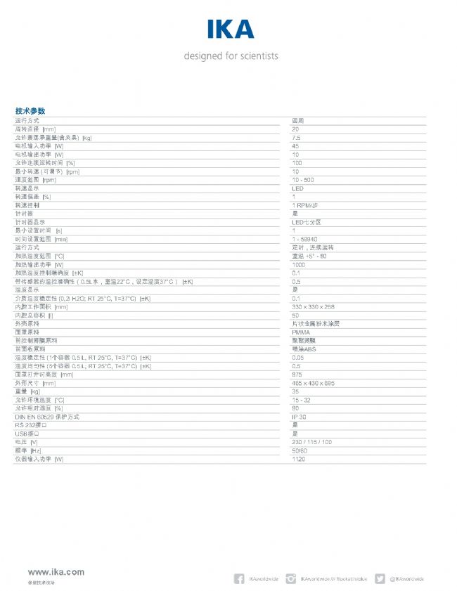 周轉直徑 20 mm 允許震蕩承重量(含夾具) 7.5 kg 電機輸入功率 45 W 電機輸出功率 10 W 允許連續(xù)運轉時間 100 % 最小轉速 (可調(diào)節(jié)) 10 rpm 速度范圍 10 - 500 rpm 轉速顯示 LED 轉速偏差 1 % 轉速控制 1 RPM/步 計時器 是 計時器顯示 LED七分區(qū) 最小設置時間 1 s 最小設置時間 1 min 最大設置時間 59940 min 運行方式 定時,連續(xù)運轉 點動功能 不 桌面振蕩制動裝置 不 用酶標板工作 不 加熱溫度范圍 室溫 +5° - 80 °C 加熱輸出功率 1000 W 加熱溫度控制精確度 0.1 ±K 帶傳感器控溫精確度 (1個容器 0.5 L H2O, RT 22°C, T=37°C) 0.5 ±K 溫度顯示 是 內(nèi)腔工作面積 330 x 330 x 258 mm 內(nèi)腔總容積 50 l 外殼原料 片狀金屬粉末涂層 面罩原料 PMMA 前控制薄膜原料 聚酯薄膜 前面板原料 噴涂ABS 溫度穩(wěn)定性 (1個容器 0.5 L, RT 25°C, T=37°C) 0.05 ±K 溫度均勻性 (5個容器 0.5 L; RT 25°C, T=37°C) 0.5 ±K 面罩打開時高度 875 mm 外形尺寸 465 x 430 x 695 mm 重量 35 kg 允許環(huán)境溫度 15 - 32 °C 允許相對濕度 80 % DIN EN 60529 保護方式 IP 30 USB接口 是 RS 232接口 是 電壓 230 / 115 / 100 V 頻率 50/60 Hz 儀器輸入功率 1120 W