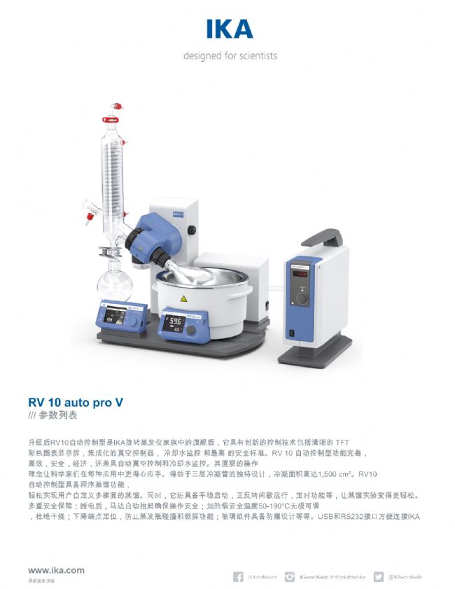 升級后RV10自動控制型是IKA旋轉(zhuǎn)蒸發(fā)儀家族中的旗艦版,它具有創(chuàng)新的控制技術(shù)包括清晰的 TFT 彩色圖表顯示屏,集成化的真空控制器, 冷卻水監(jiān)控 和最高 的安全標準。RV 10 自動控制型功能完善,