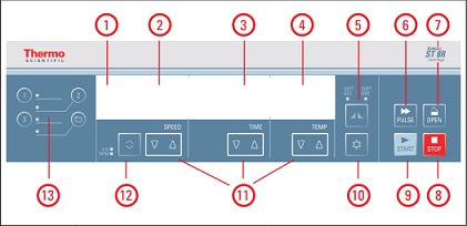 The control panel contains the keys and displays of the centrifuge (only the power switch is located on the right side (Sorvall ST 8R) of the device).