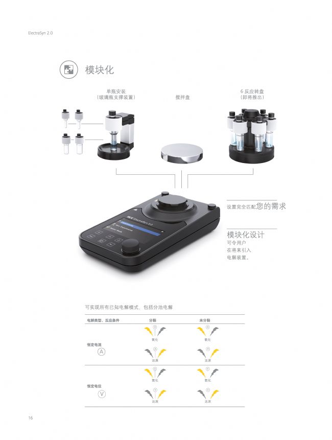 ElectraSyn 2.0 將三種不同的儀器融合在一起,以促進(jìn)電化學(xué)在有機(jī)合成中的廣泛應(yīng)用,包括:恒電位儀、分析裝置和攪拌器