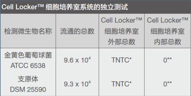 將兩種常規(guī)地細胞培養(yǎng)污染物置于新型蜂巢式Cell Locker™ 細胞培養(yǎng)室CO2 培養(yǎng)箱中,對蜂巢式Cell Locker™ 細胞培養(yǎng)室系統(tǒng)進行檢測,并沒有微生物能夠進入Cell Locker™ 細胞培養(yǎng)室。