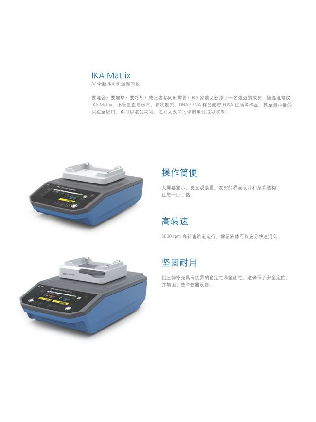 IKA 家族又新添了一名強勁的成員:恒溫混勻器 IKA Matrix Orbital。 IKA Matrix Orbital可處理各式不同的樣品。不管是血液標本,藥物制劑,DNA / RNA 樣品或者 ELISA 試驗等樣品,甚至最小量的實驗室應(yīng)用,都可以混合均勻,達到無交叉污染的最佳混勻效果。